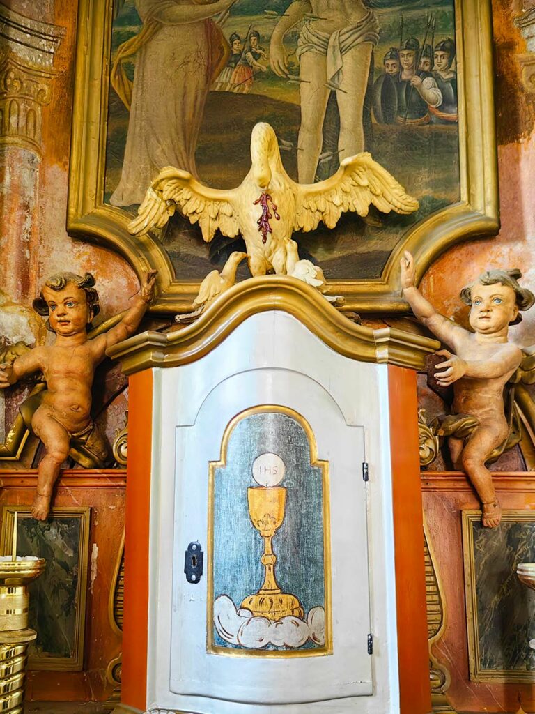 U svetištu na stropu freska je Presvetog Trojstva. Desno je od svetišta pomoćni oltar posvećen svetom Filipu apostolu, a iznad je medaljon svetog Franje Ksaverskog. Lijevo je od svetišta pomoćni oltar posvećen svetoj Ruži Limskoj, iznad je medaljon sa slikom svete Barbare, a na oltaru je kip Majke Božje Bistričke.