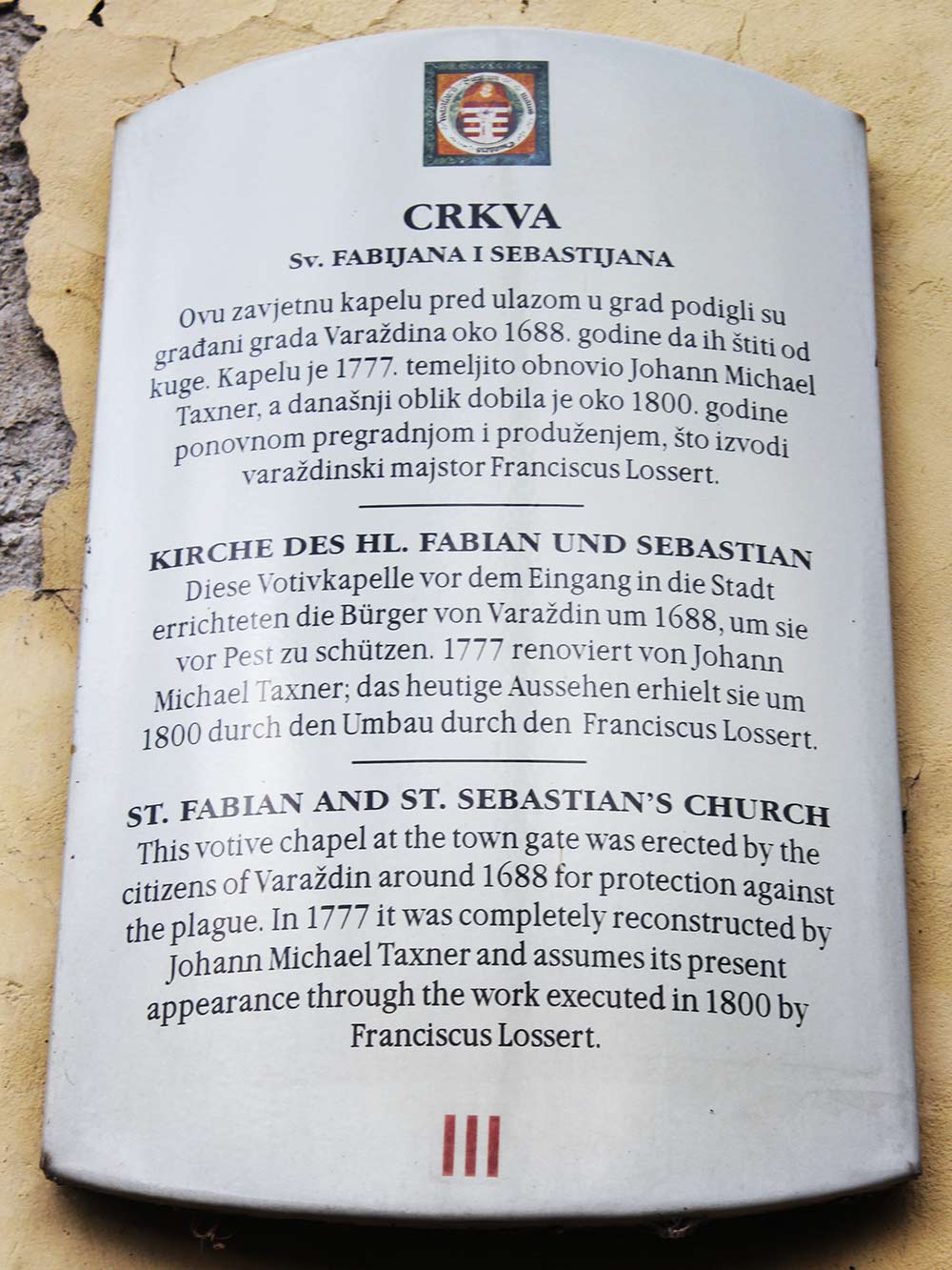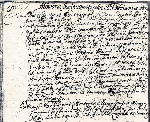 U Liber Fassionum (1674. – 1714.), zapisu gradskog notara, 14. rujna 1680. godine zapisano je da je gradsko vijeće odlučilo podići kapelicu u čast svetih Fabijana i Sebastijana, kako bi zahvalili za poštedu od kuge. Odluka je bila jednoglasna, a grad je odlučio zajedničkim troškovima izgraditi kapelicu izvan predgrađa, uz pomoć građana koji su sudjelovali u prikupljanju kamenja i donacijama. Za upravljanje kapelicom imenovani su Juraj Gašparić i Mihael Gašparlin.