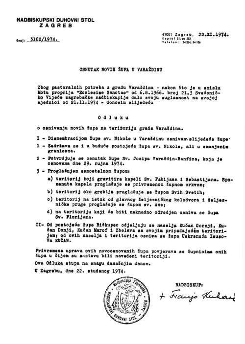 30. studenog 1979. godine zagrebački nadbiskup Franjo Kuharić svečano je otvorio novu župu u Varaždinu – Župu sv. Fabijana i Sebastijana. Tijekom svečanosti nadbiskup je blagoslovio križni put i novu ispovjedaonicu, koju je darovala poluslijepa župljanka Josipa Obadić, koja se odrekla putovanja u Lurd kako bi omogućila ovaj dar. Također, blagoslovio je kopiju kipa Majke Božje Bistričke te krstio dvoje najmlađih župljana, Tomislava Martineza i Kristinu Fluks, koje je osobno upisao u novu Maticu krštenih.